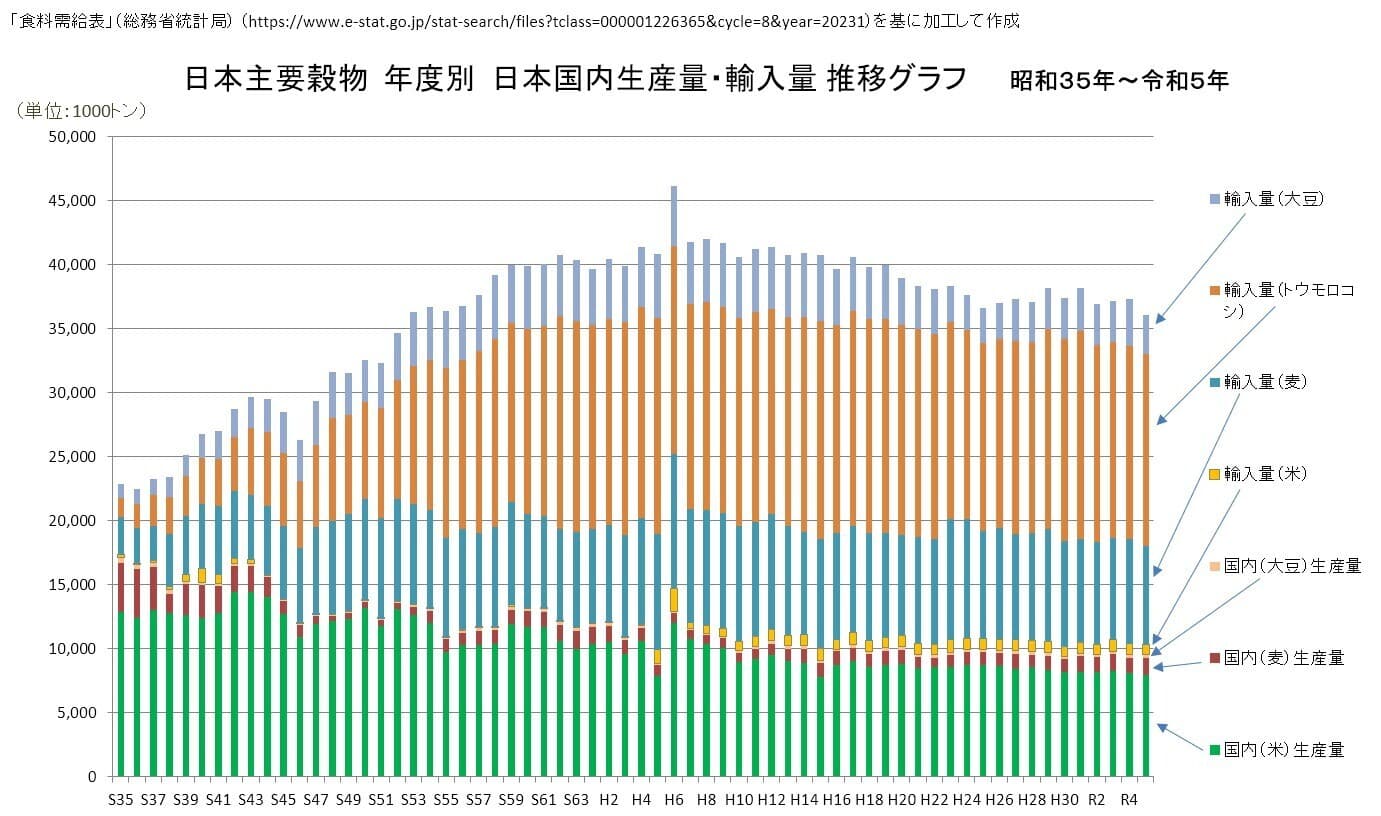 - 下記グラフは国内穀物生産量/穀物輸入量の推移グラフです。